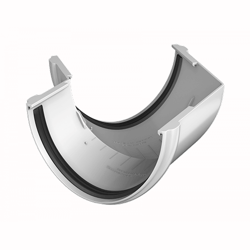Угол желоба предназначен для соединения желобов на карнизах, которые лежат в одной плоскости, но расположены перпендикулярно относительно друг друга.